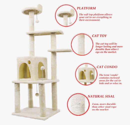 | Krásné a pohodlné | Přirozená textura a barva dřeva šetrného k životnímu prostředí přidává do rámu lezení stromu kočičího stromu na dřevěné a přirozené atmosféru a poskytuje pro kočky teplé a pohodlné klidové prostředí pro kočky |